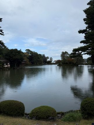 北陸の冬の風物詩「雪吊り」は始まったばかりでまだ数本でしたが、緑が濃い風情ある景色